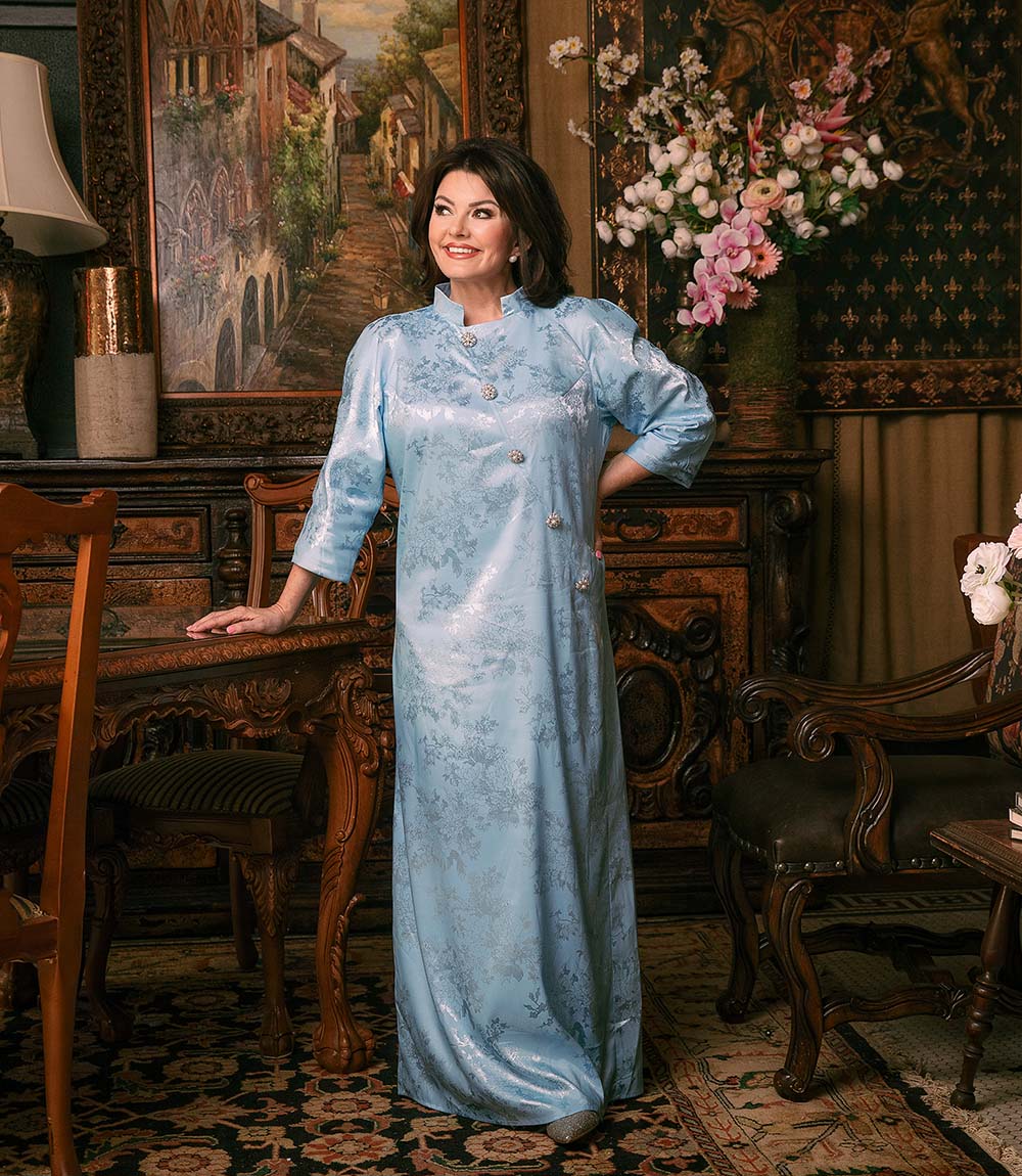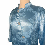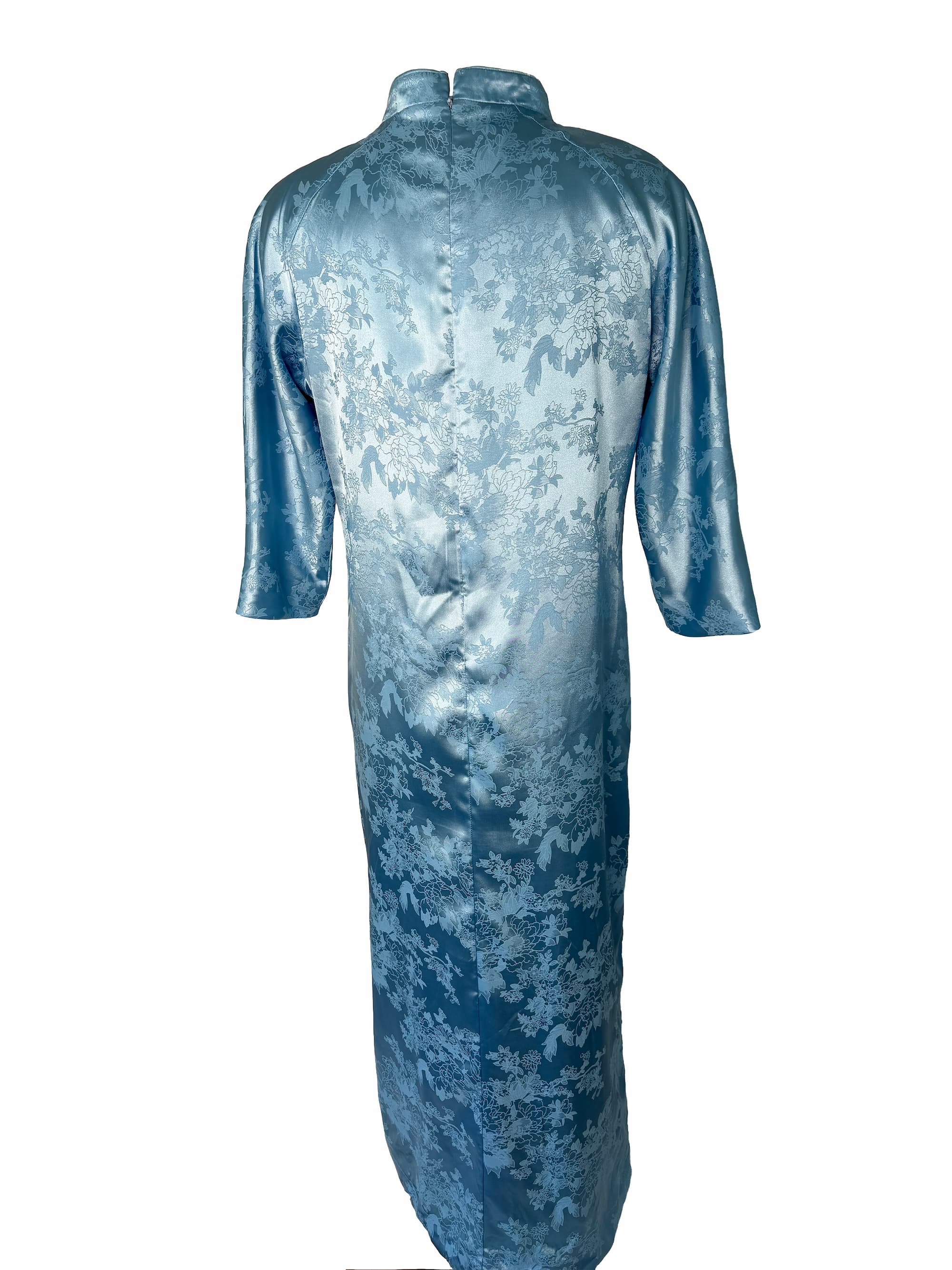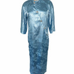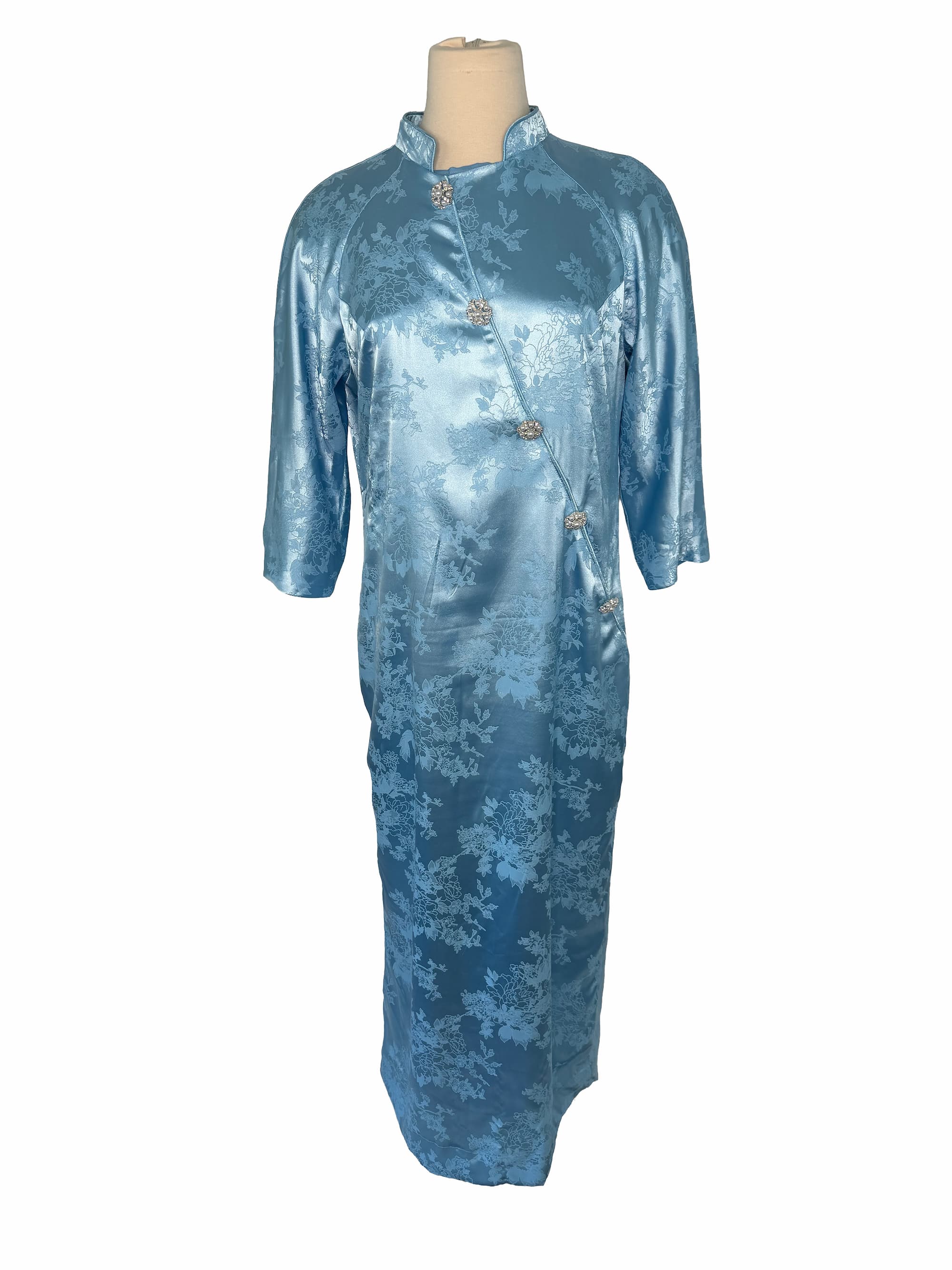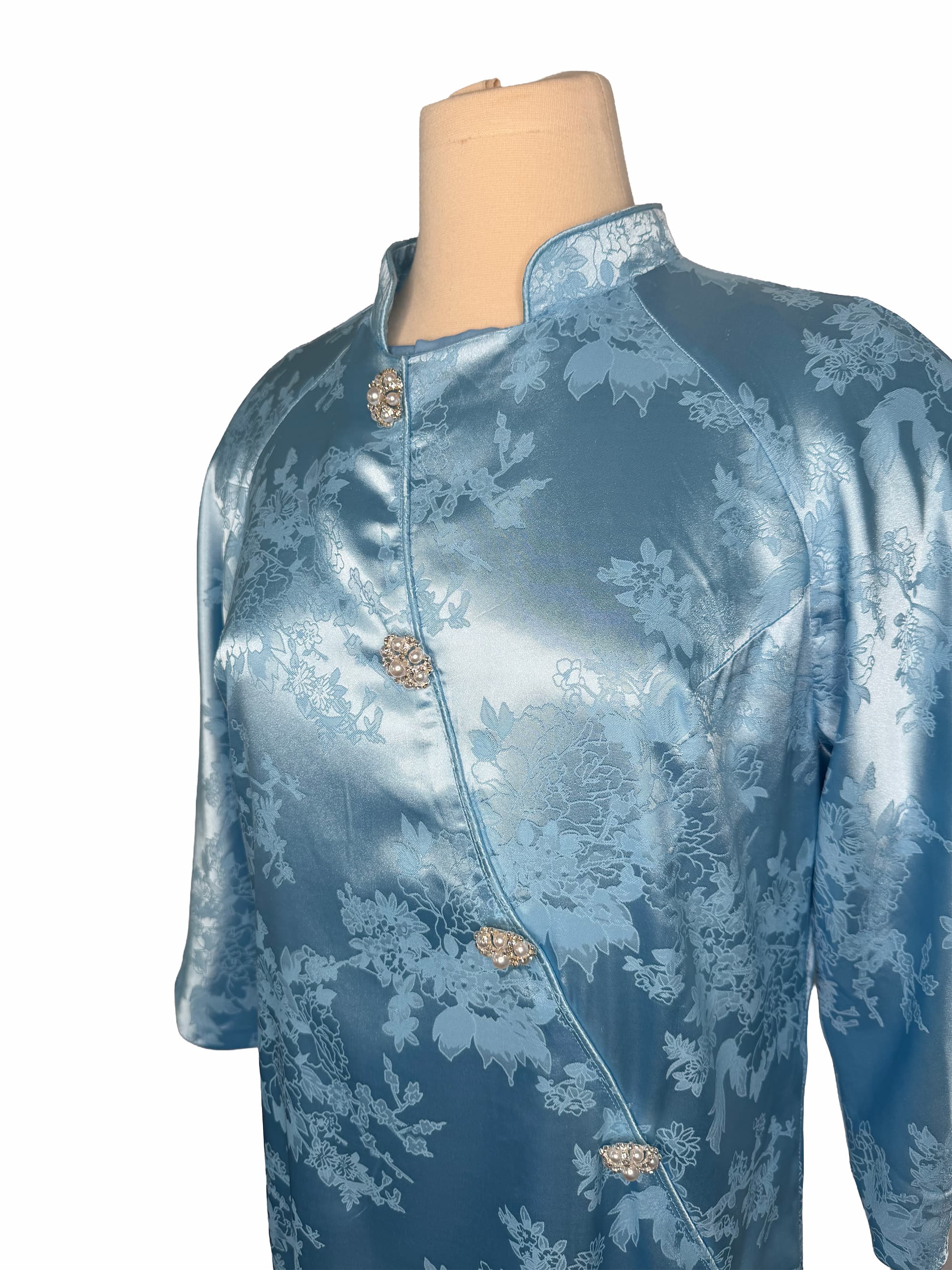 Crafted in a lightweight jacquard fabric with a soft, satin-like sheen, this elegant caftan is designed in a refined, slightly fitted silhouette with just enough ease for comfortable wear. Pearl and rhinestone buttons trace a graceful diagonal across the front, adding subtle sparkle and couture-inspired detail. Silver piping accents the mandarin collar and sleeves, while a two-inch hem lends a polished, elegant finish. Fully lined in a smooth, silk-like fabric for comfort and structure, this piece blends timeless sophistication with thoughtful design. The perfect slightly "fitted" Caftan.