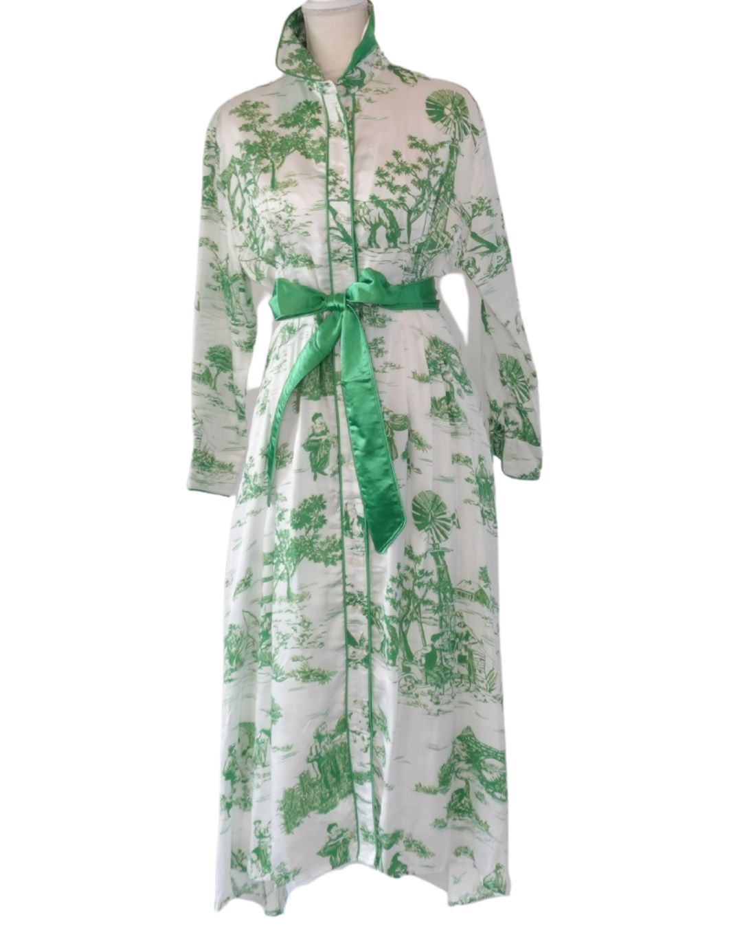 The Jill Dress in Green Dutch Toile blends refined charm with modern-day ease. Crafted from a lightweight polyester fabric, it features a rich Dutch toile print in warm green tones that feel both classic and fresh. The collared neckline, full-length button front, and long sleeves offer timeless shirt dress structure, while the removable sash belt lets you tailor the fit to your liking. Finished with functional side pockets and a breezy midi length, the Jill Dress is perfect for daytime occasions where style and comfort go hand in hand. From spring garden strolls to weekend brunches, it’s your invitation to wear tradition with a twist.