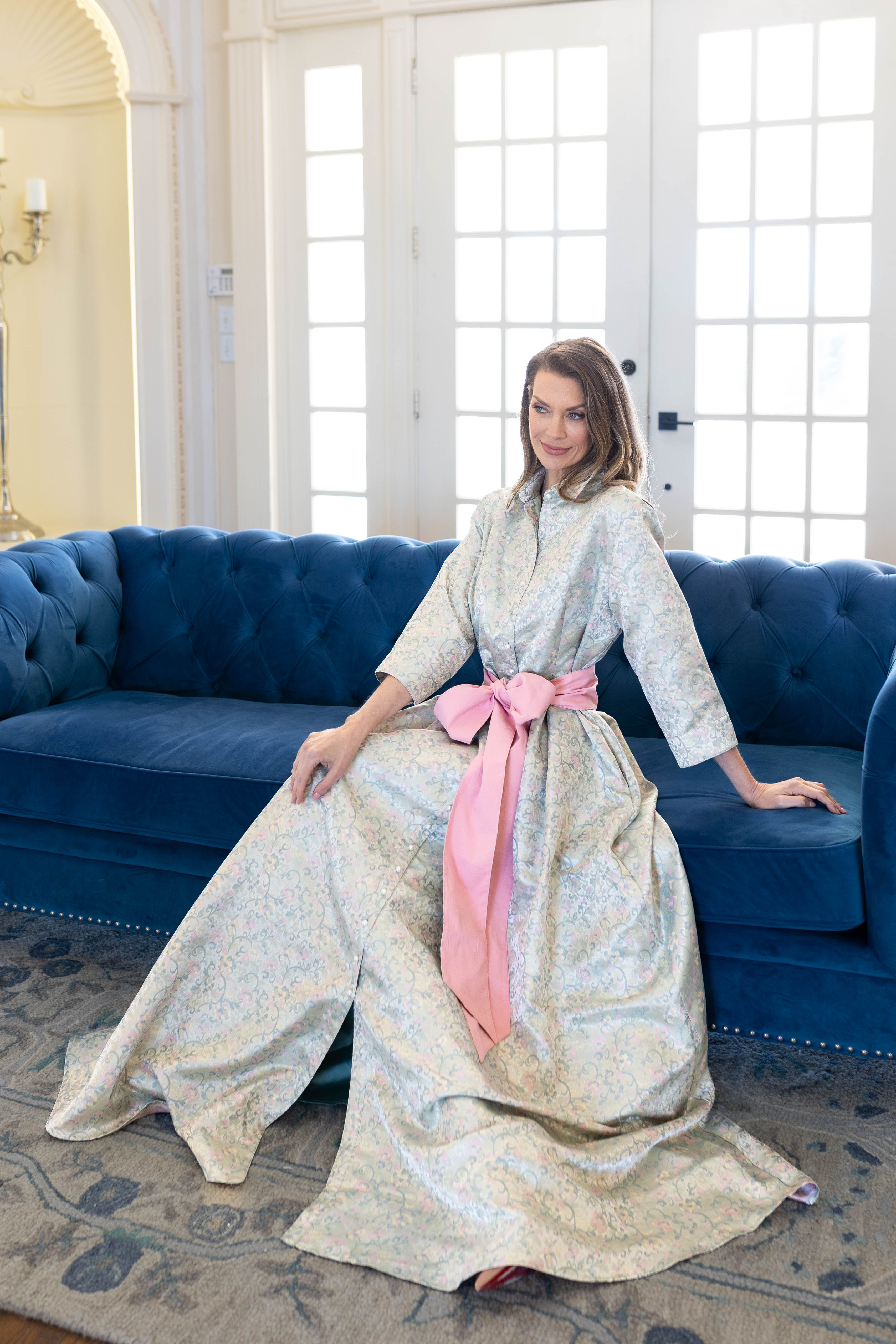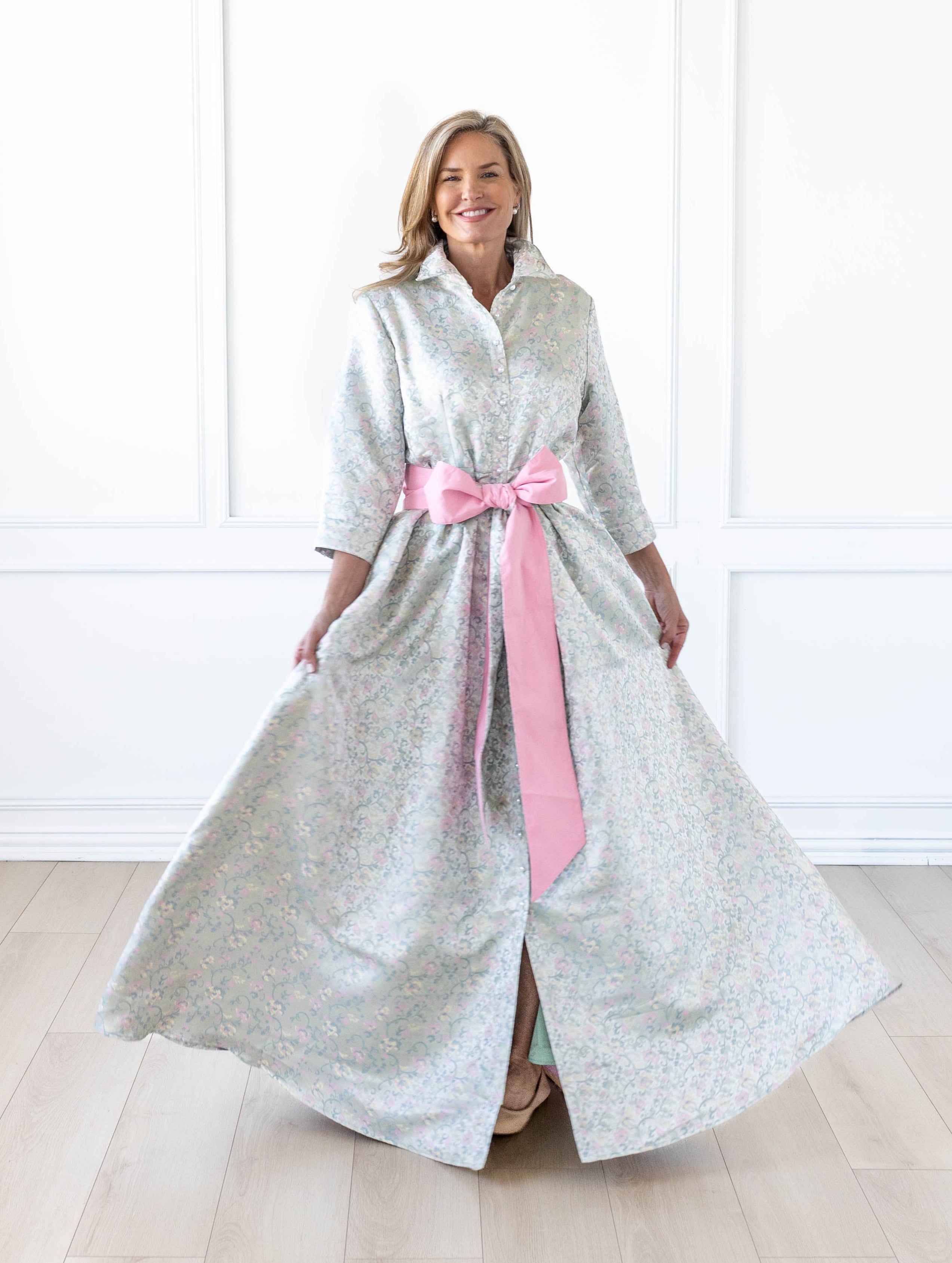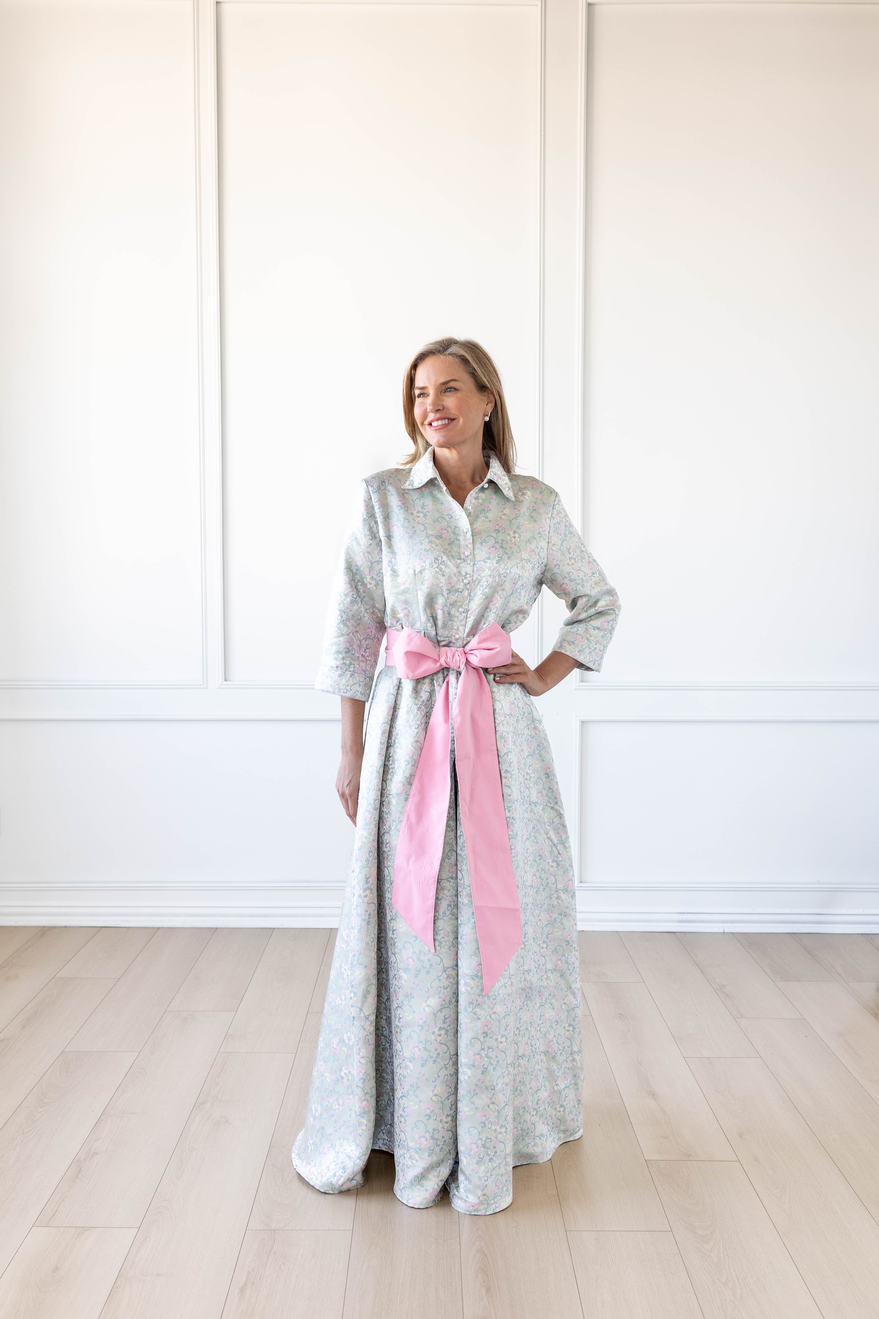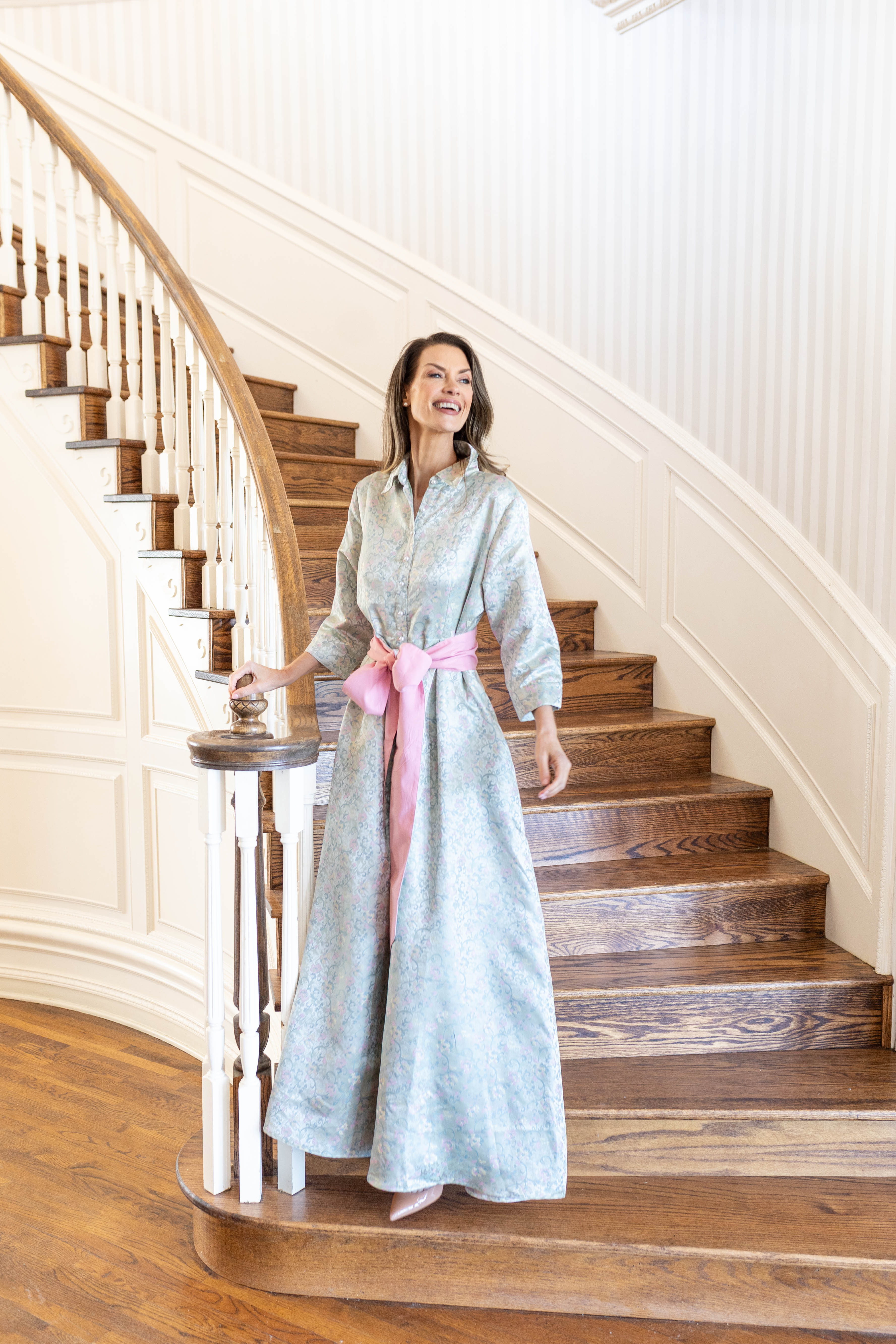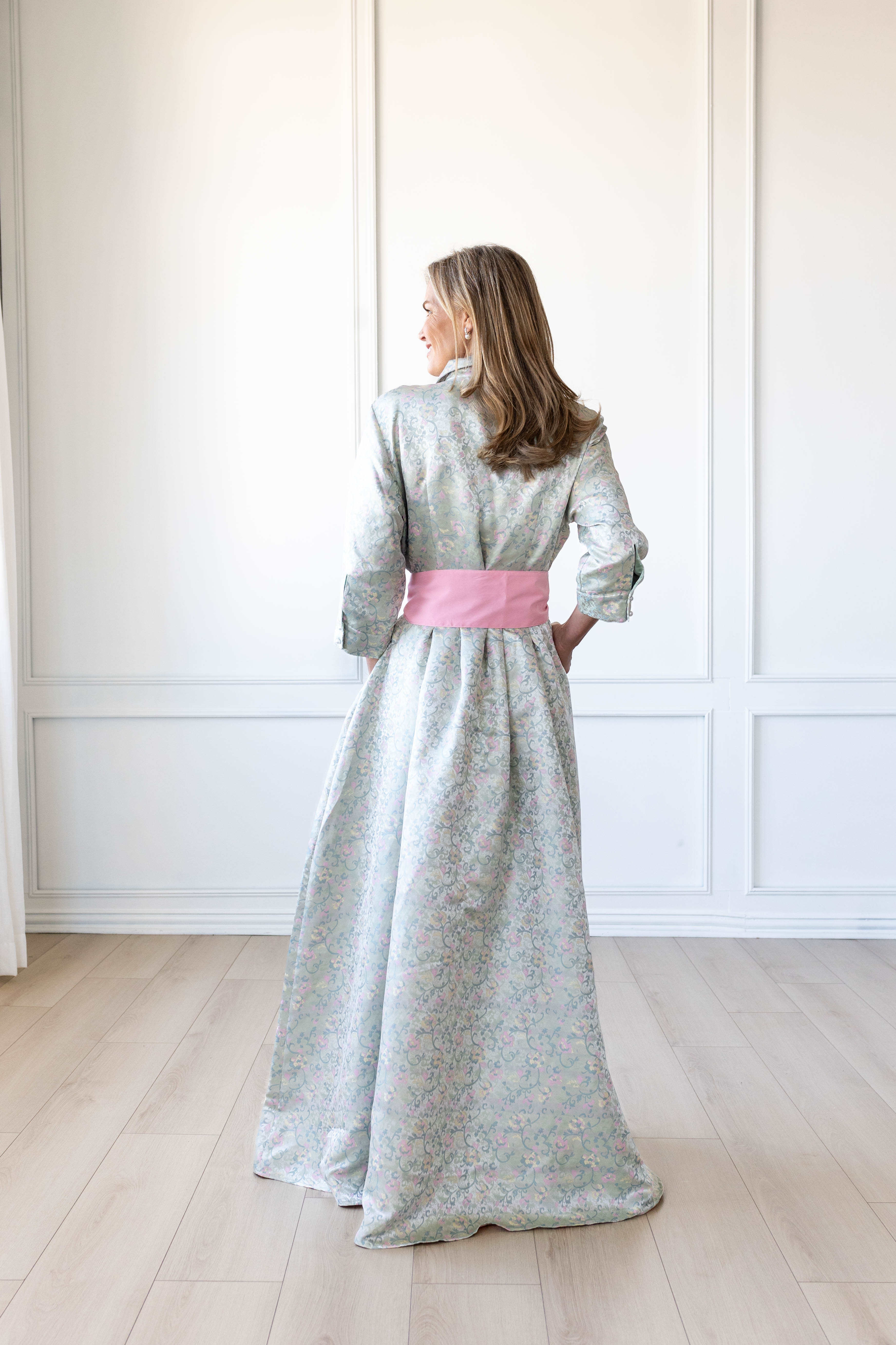 The Gloria Dress by Kim Lolley Designs is a stunning floor-length A-line dress designed for timeless grace and versatile wear. Featuring delicate pearl button closures, pleats for elegant movement, and a detachable belt for customizable styling, this dress combines sophistication with comfort. The 3/4 sleeves and luxurious silk lining add to its polished look, while the addition of pockets makes it as practical as it is beautiful. Whether you’re celebrating as the mother of the bride, attending a tea or derby party, enjoying an elegant dinner, or embarking on vacation adventures, the Gloria Dress ensures you’ll look and feel your best for any special occasion. The mint floral print brings a touch of vintage charm, symbolizing renewal and fresh beginnings. This delicate pattern combines soft pastels with timeless florals, evoking a sense of grace and femininity.