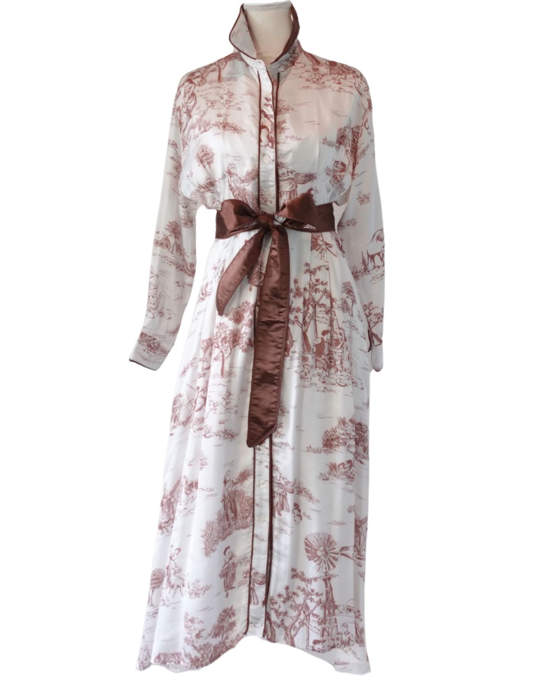 The Jill Dress in Brown Dutch Toile blends refined charm with modern-day ease. Crafted from a lightweight polyester fabric, it features a rich Dutch toile print in warm brown tones that feel both classic and fresh. The collared neckline, full-length button front, and long sleeves offer timeless shirt dress structure, while the removable sash belt lets you tailor the fit to your liking. Finished with functional side pockets and a breezy midi length, the Jill Dress is perfect for daytime occasions where style and comfort go hand in hand. From spring garden strolls to weekend brunches, it’s your invitation to wear tradition with a twist.