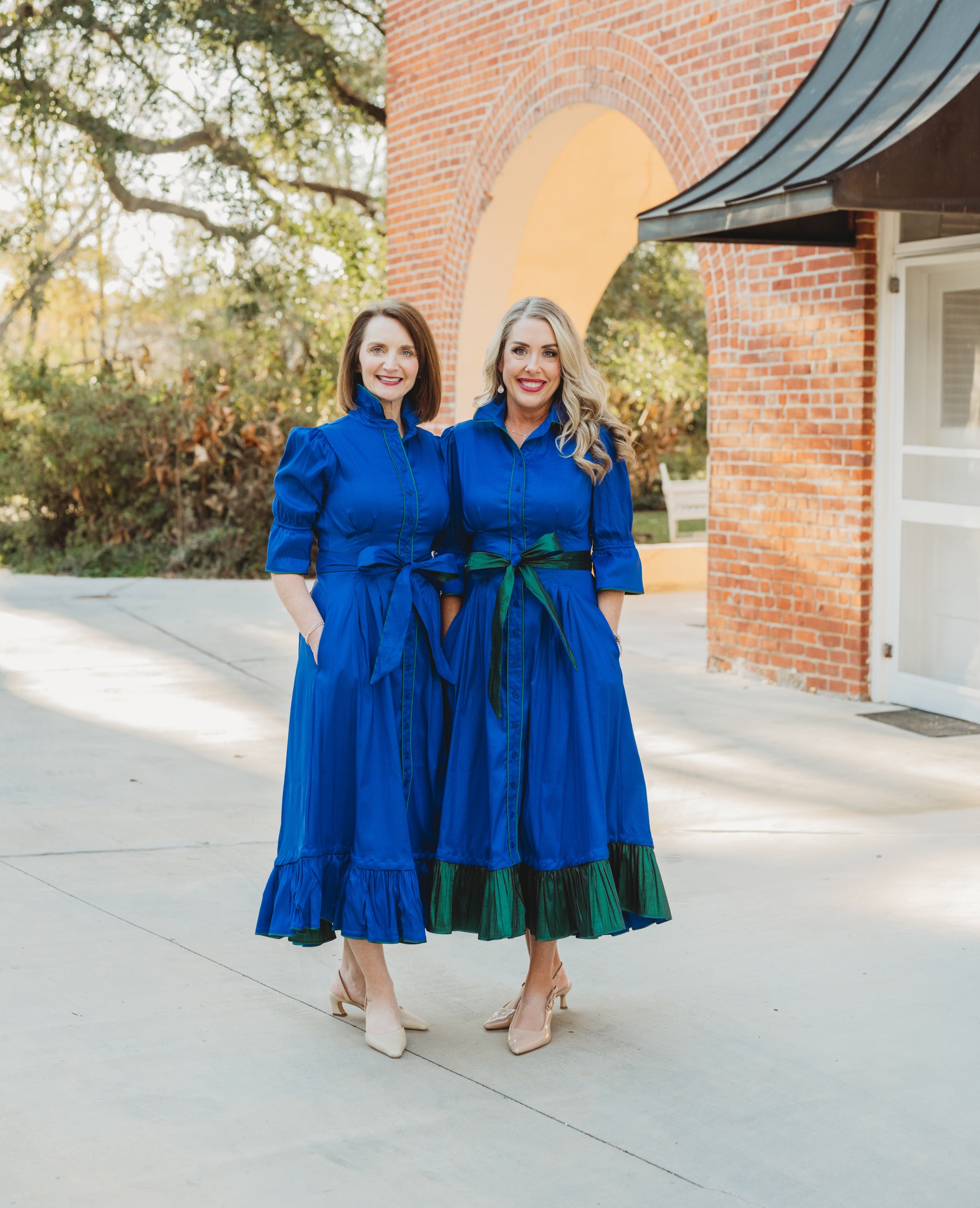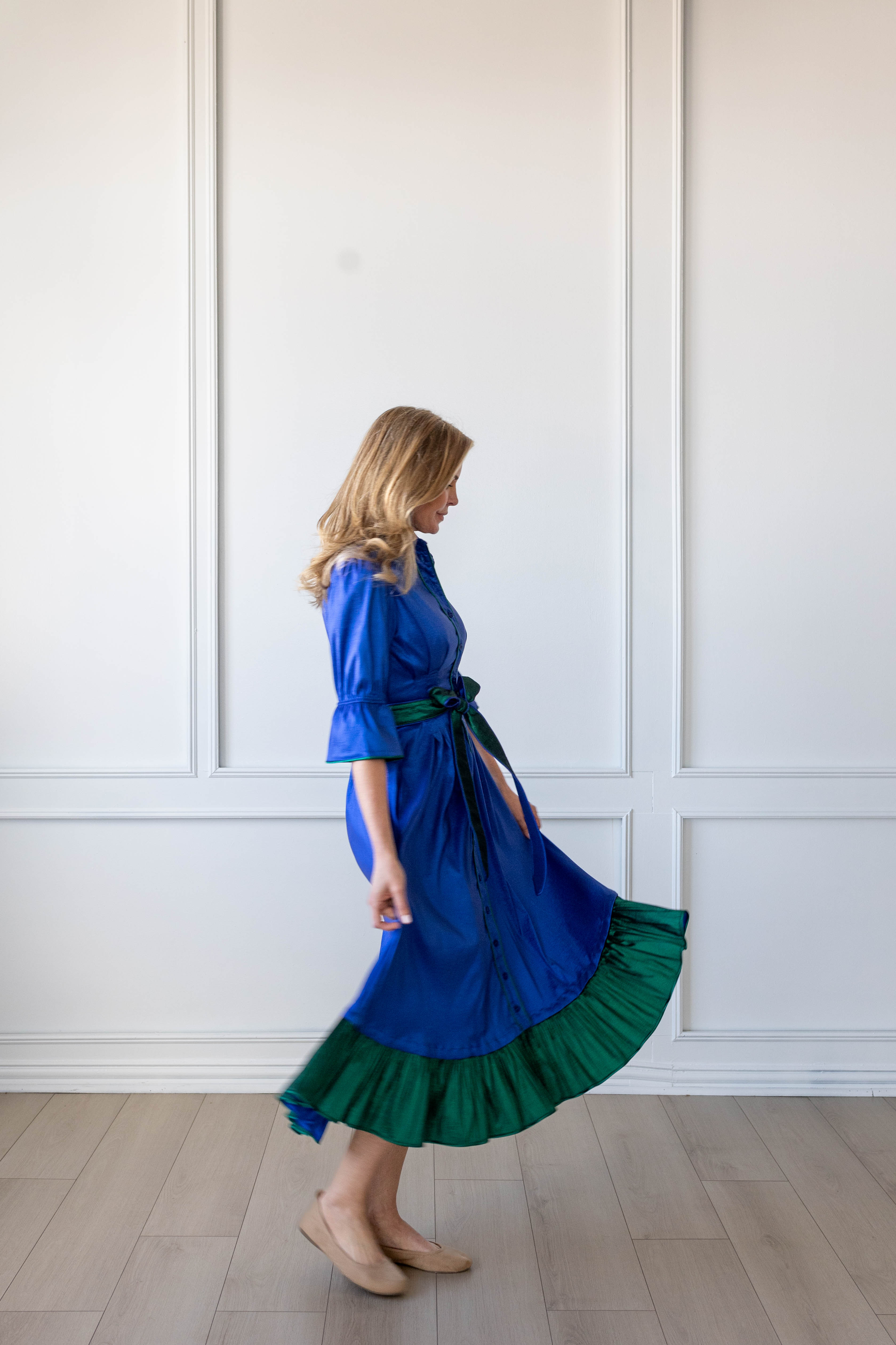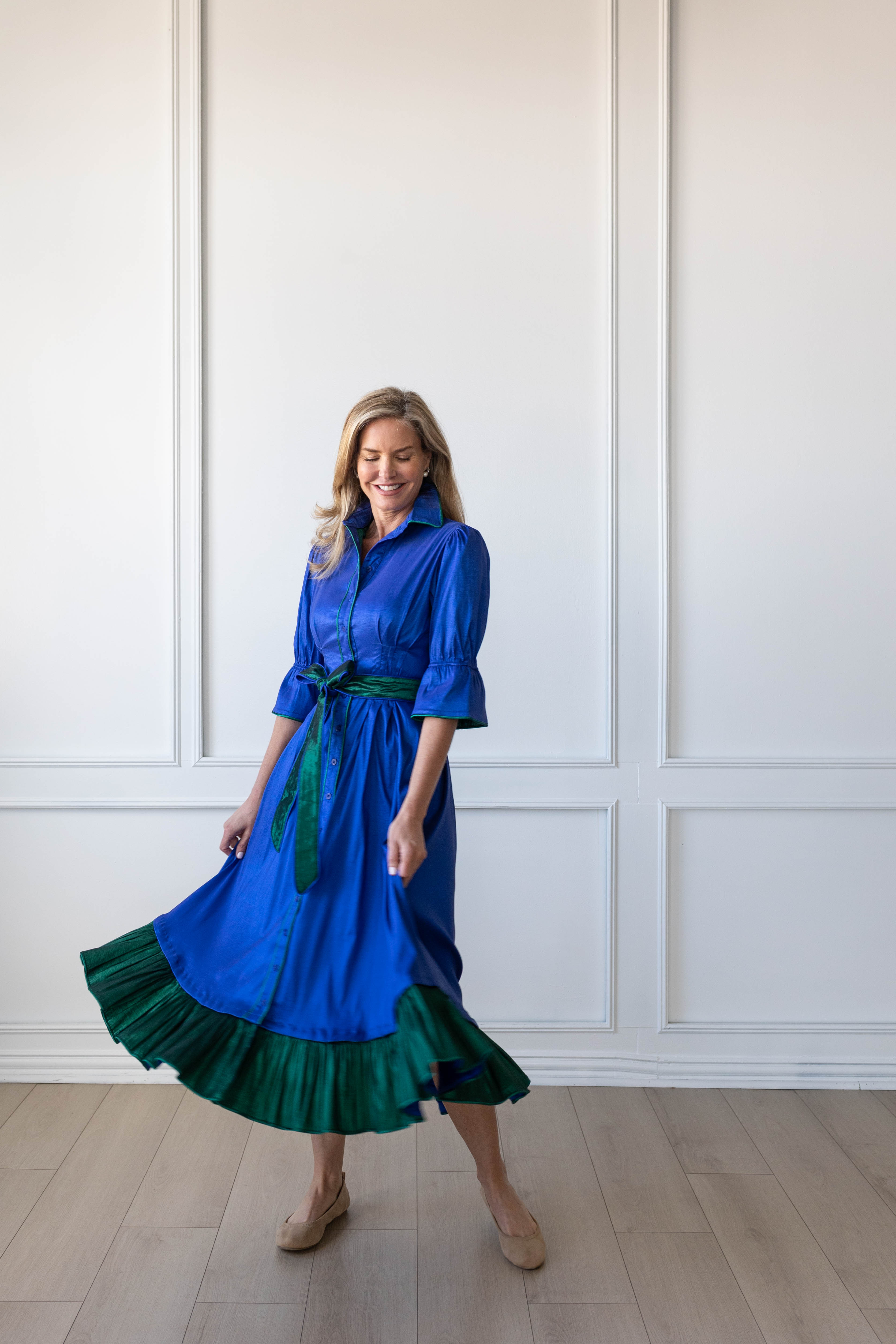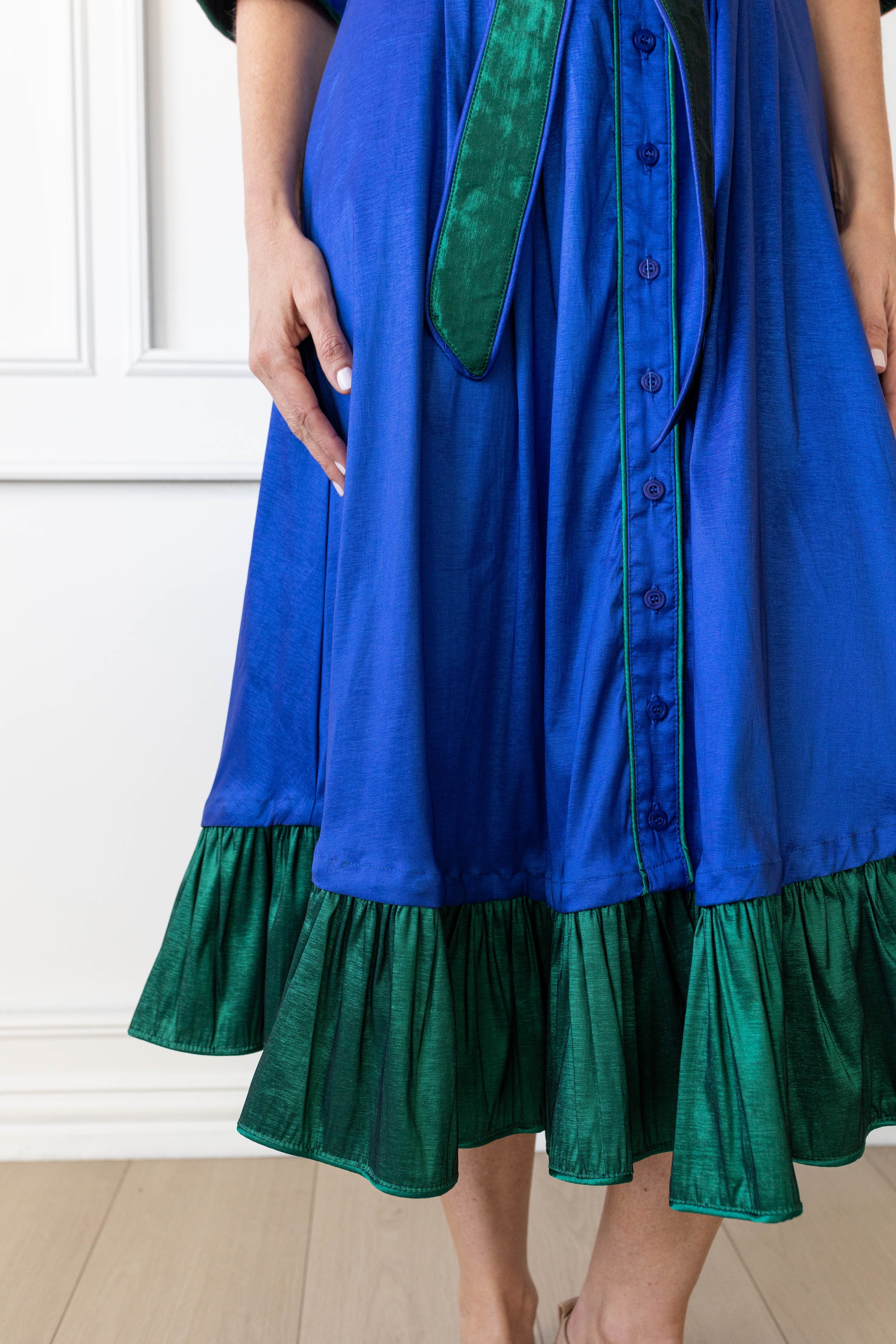 Carol Dress – Royal Blue and Emerald Taffeta Maxi Dress with Reversible Hem