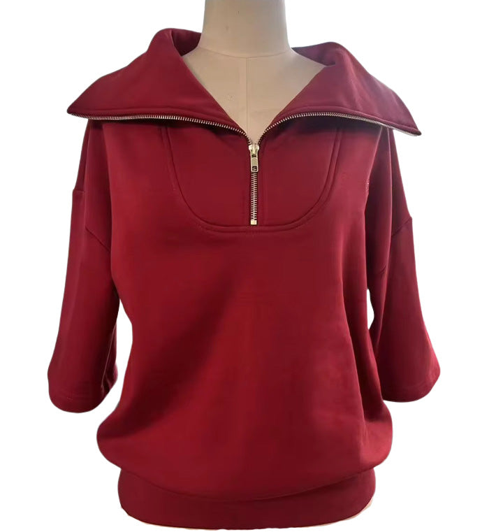 Elevate your everyday style with this zip-front pullover top in a rich, autumn red. Designed with a wide collar and half-zip neckline, it gives you the versatility to wear it zipped up for a cozy feel or open for a relaxed look. The three-quarter sleeves and slightly loose fit make it a perfect transitional piece—easy to layer, yet chic enough to stand on its own.