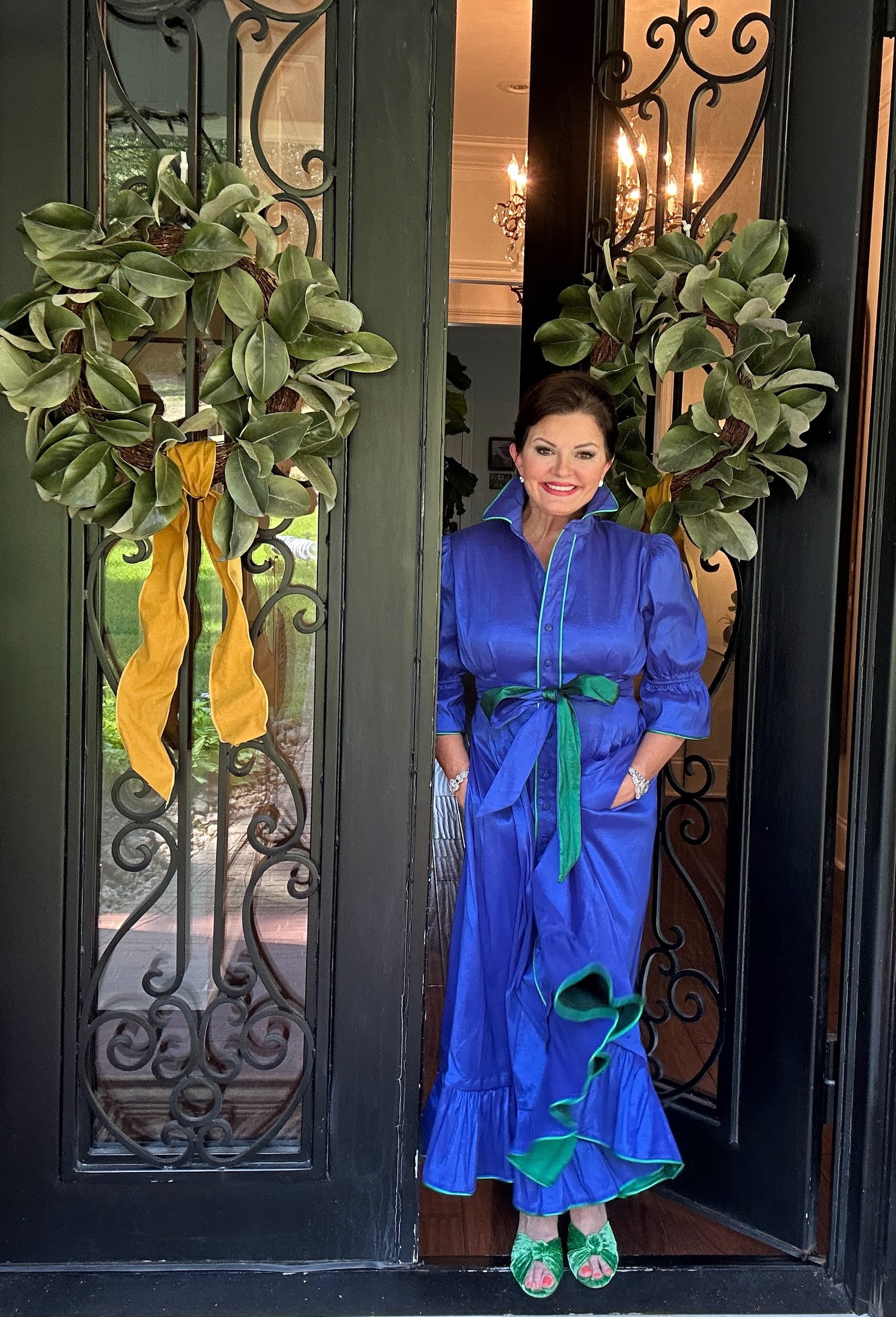Carol Dress – Royal Blue and Emerald Taffeta Maxi Dress with Reversible Hem