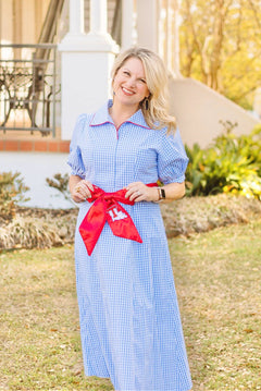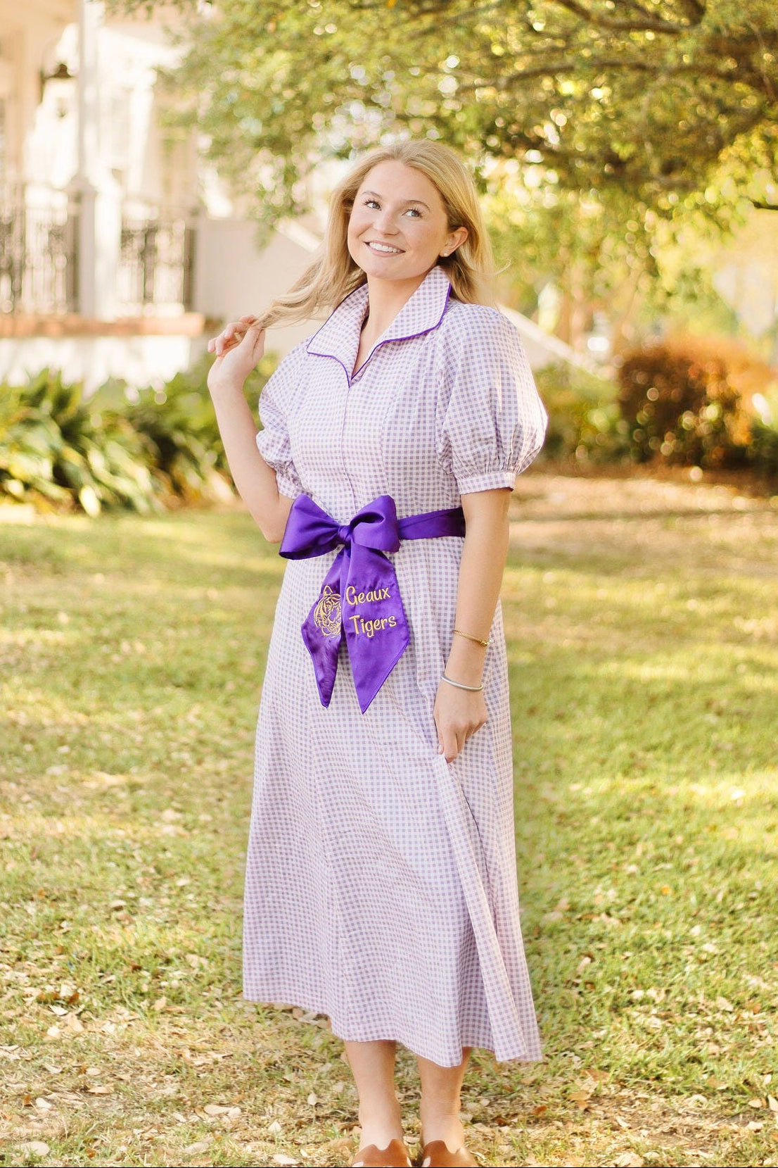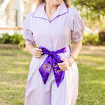 Our Jennifer dress is a charming purple and white check dress featuring a removable purple sash for versatile styling. Personalize your look by selecting from themed sash options celebrating LSU, Ole Miss, Tech, and patriotic 4th of July designs. The dress also comes in a blue check option for added variety.