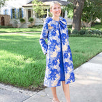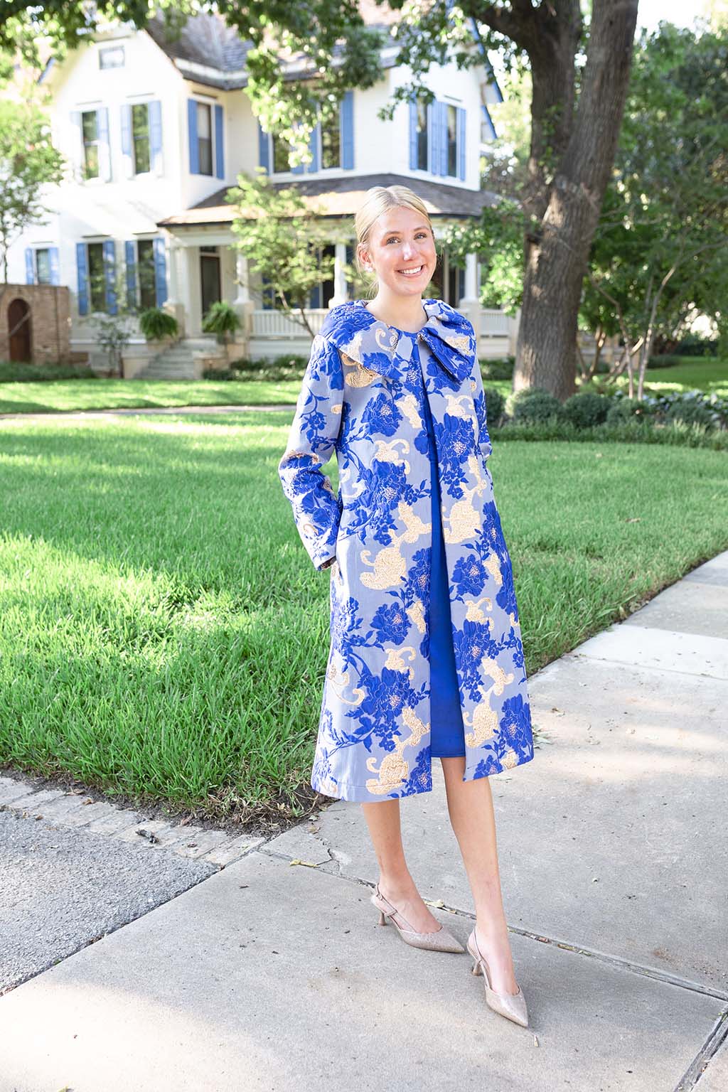 Elevate every special occasion with the timeless beauty of The Jackie Coat. Designed to make an entrance, this stunning long-line layer is crafted from a luxurious floral brocade that blends vibrant cobalt blue with soft, shimmering neutrals for a look that is both classic and statement-making.